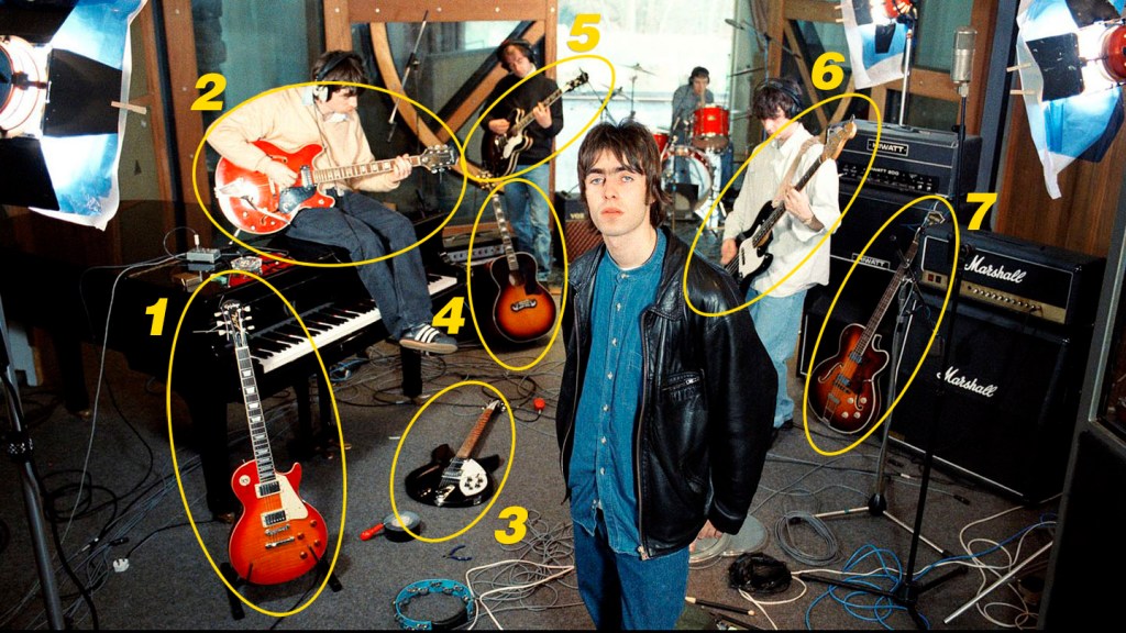 Noel’s main acoustic guitar at the time was a Sunburst Epiphone EJ-200, made in Korea in the early ’90s. It also features in the artwork of Definitely Maybe and the Cigarettes & Alcohol single. The number of classic songs that have probably been written on this humble acoustic is astounding.