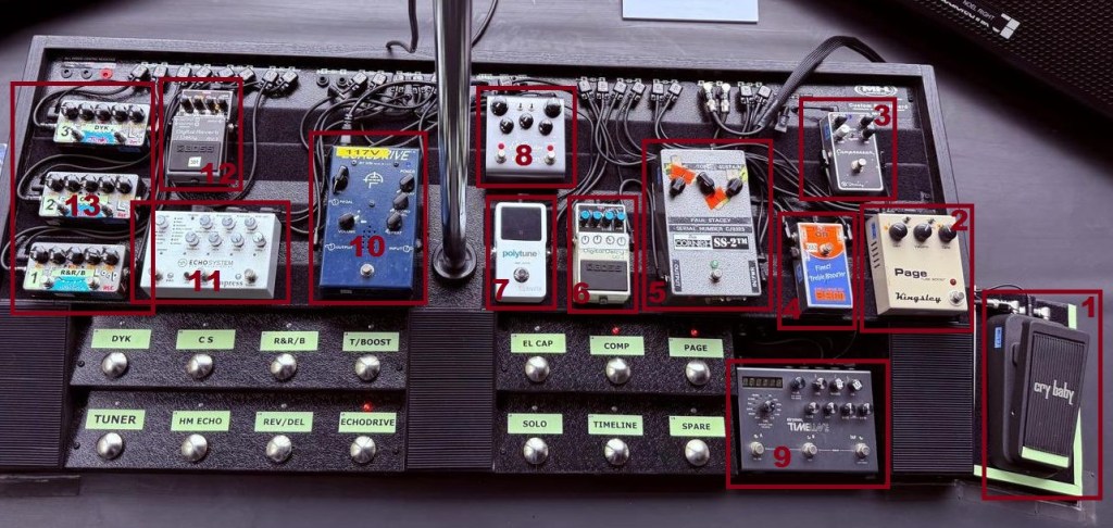 Update – The article has been expanded with additional details on how each pedal is used across different songs. Suggestions, corrections, and insights are always welcome: feel free to reach out!