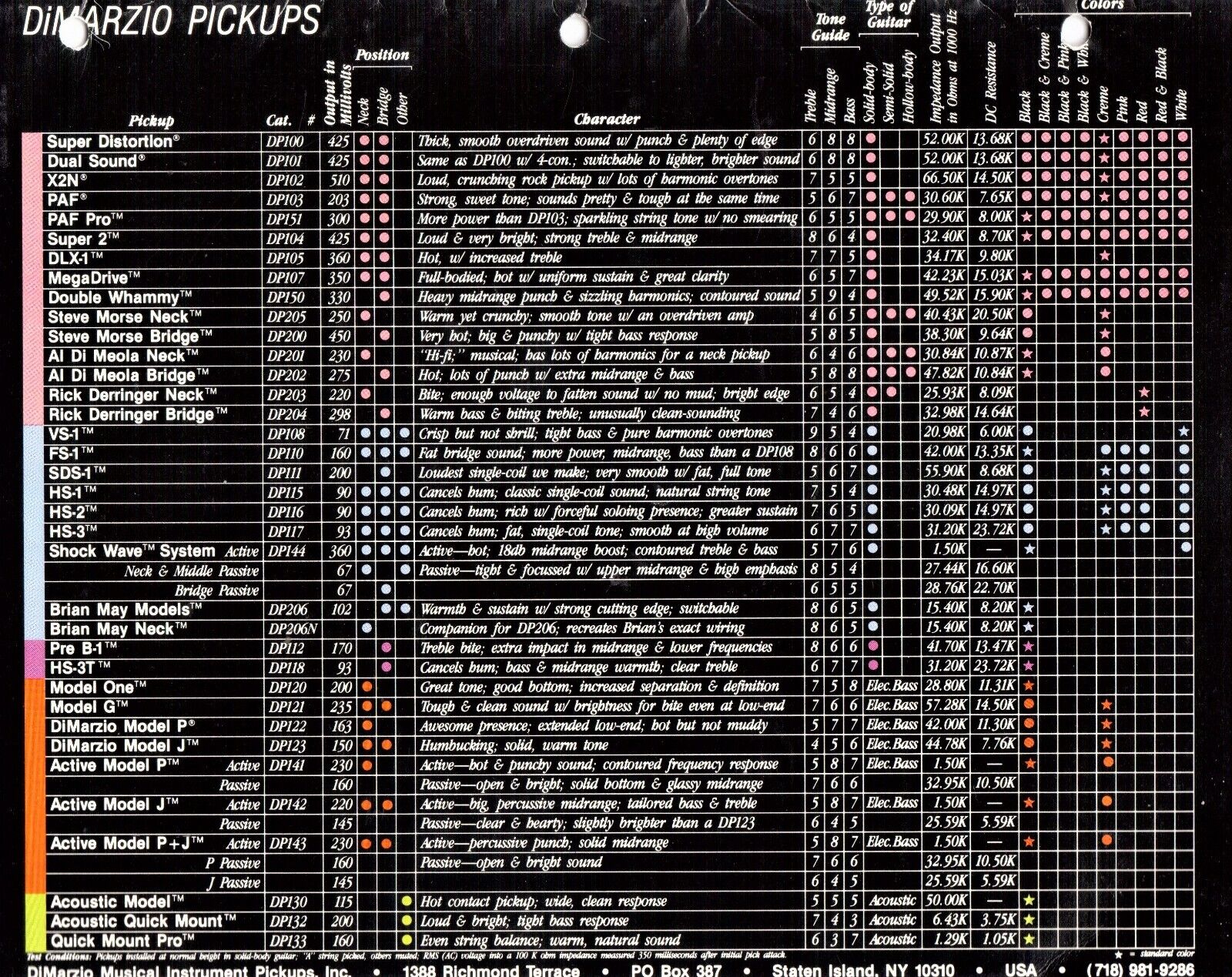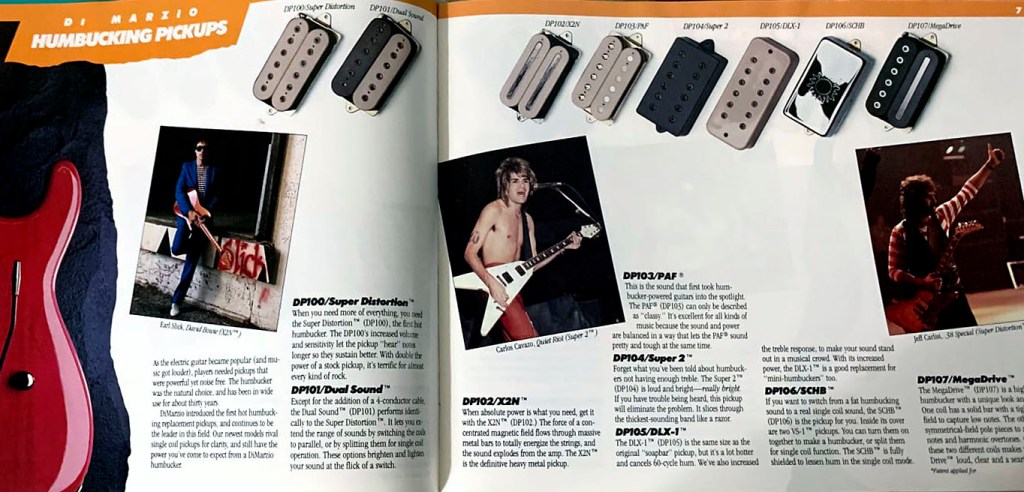 The specs of the Super Distortion (DP100) and the Dual Sound (DP101) are identical, as confirmed in several DiMarzio catalogs from the era, including the 1987 edition shown above.