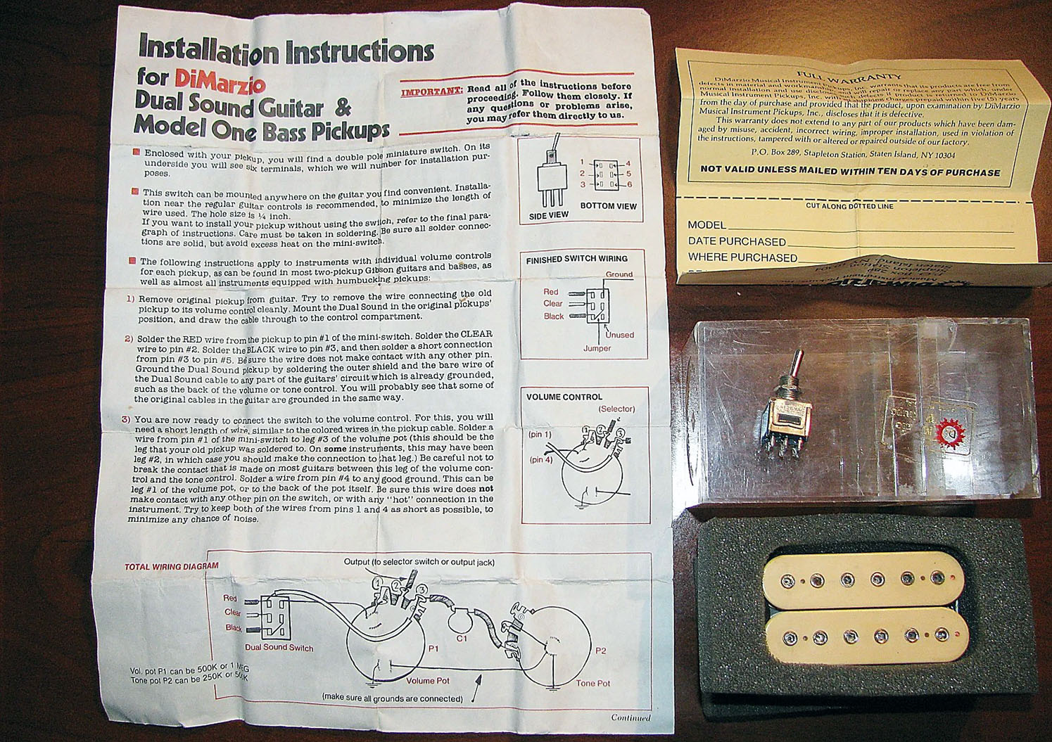 Why bother, when DiMarzio already offered the Dual Sound? It was identical to the Super Distortion but shipped with four-conductor wiring. Early models had three-conductor wiring, which was a bit less flexible but still allowed coil-splitting.7