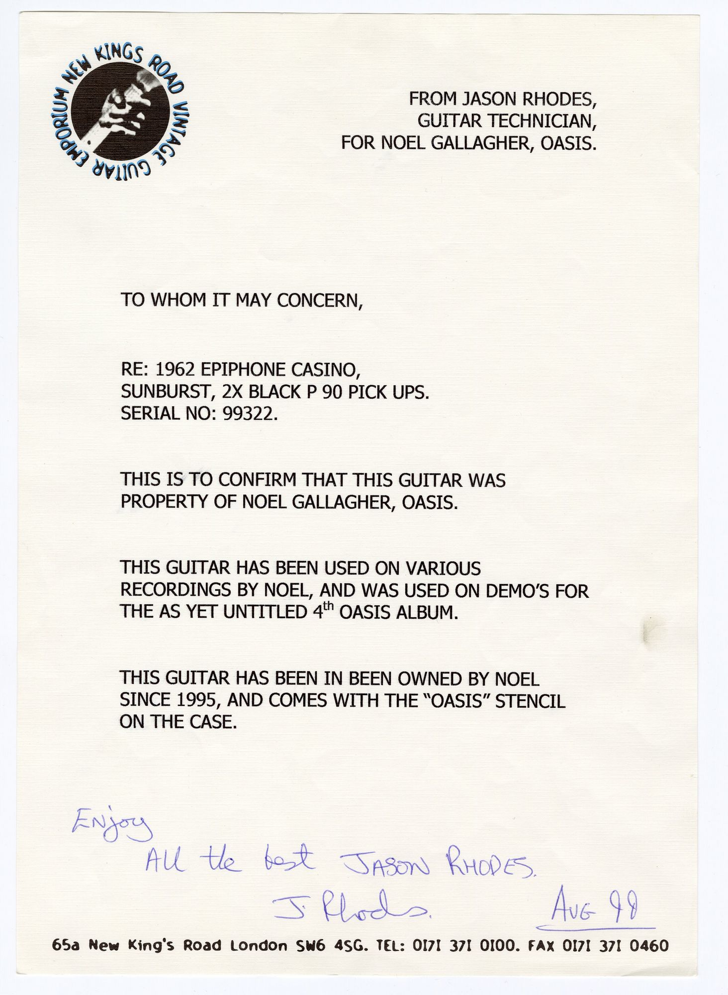 Details Noel bought this Casino in late 1995, advised by Paul Weller. It was advertised in a newspaper, and Noel went to the seller's house to collect it.1 He mentioned the guitar in a November 1995 interview with Total Guitar magazine: "I've just bought a Casino, which is the dog's knackers. I haven't used it yet because it's at the guitar's doctor being set up."2 The Casino can be seen played by Bonehead in a couple of images taken by Jill Furmanovsky during the recording sessions of Be Here Now.3 It was later used to record the demos for Standing in the Shoulder of Giants in 1999. In August 1999, the Casino was sold (with some other guitars) to a London Guitar shop. In November 2022 it reappeared at an auction, where it was sold for £56k.4