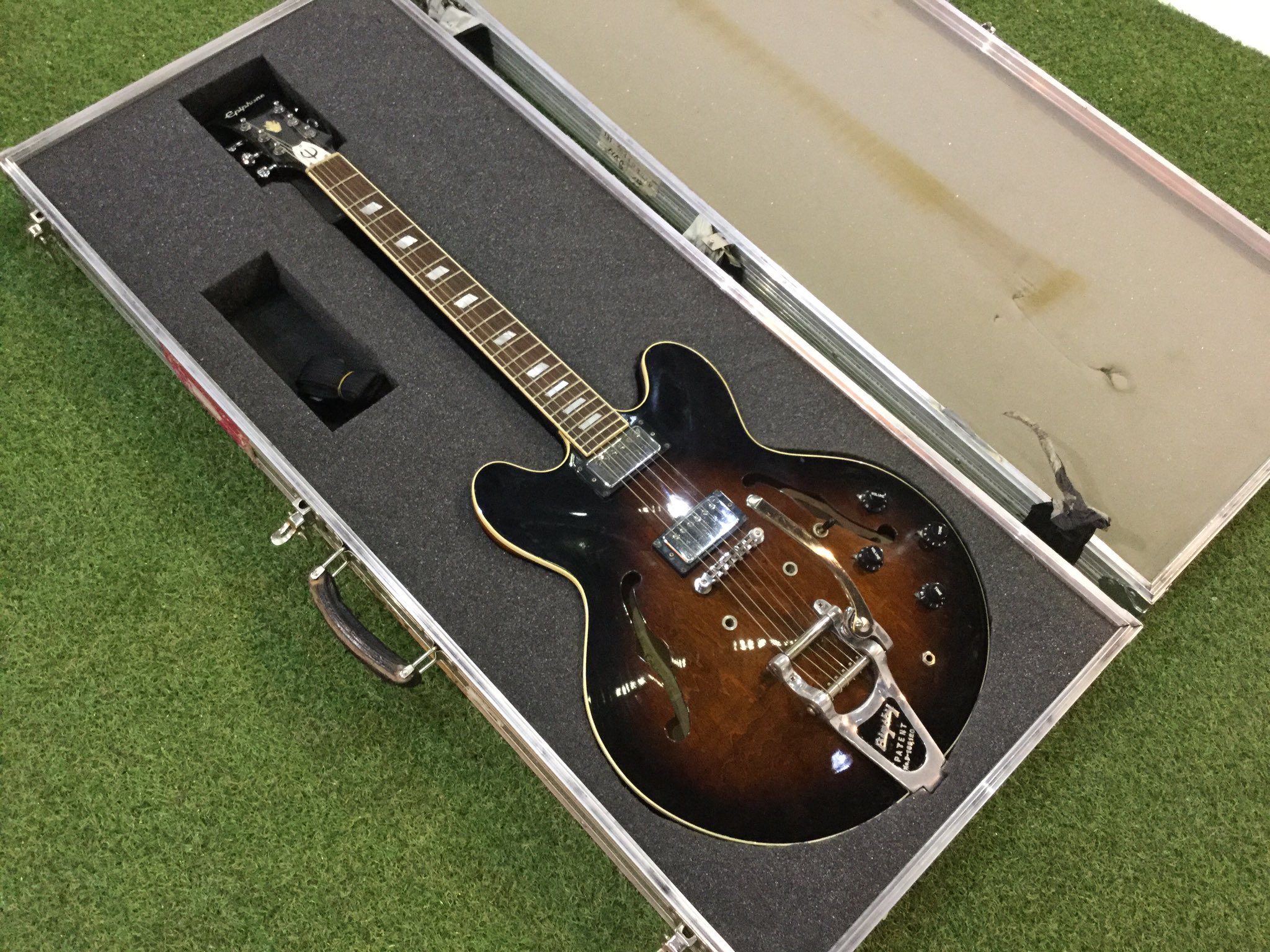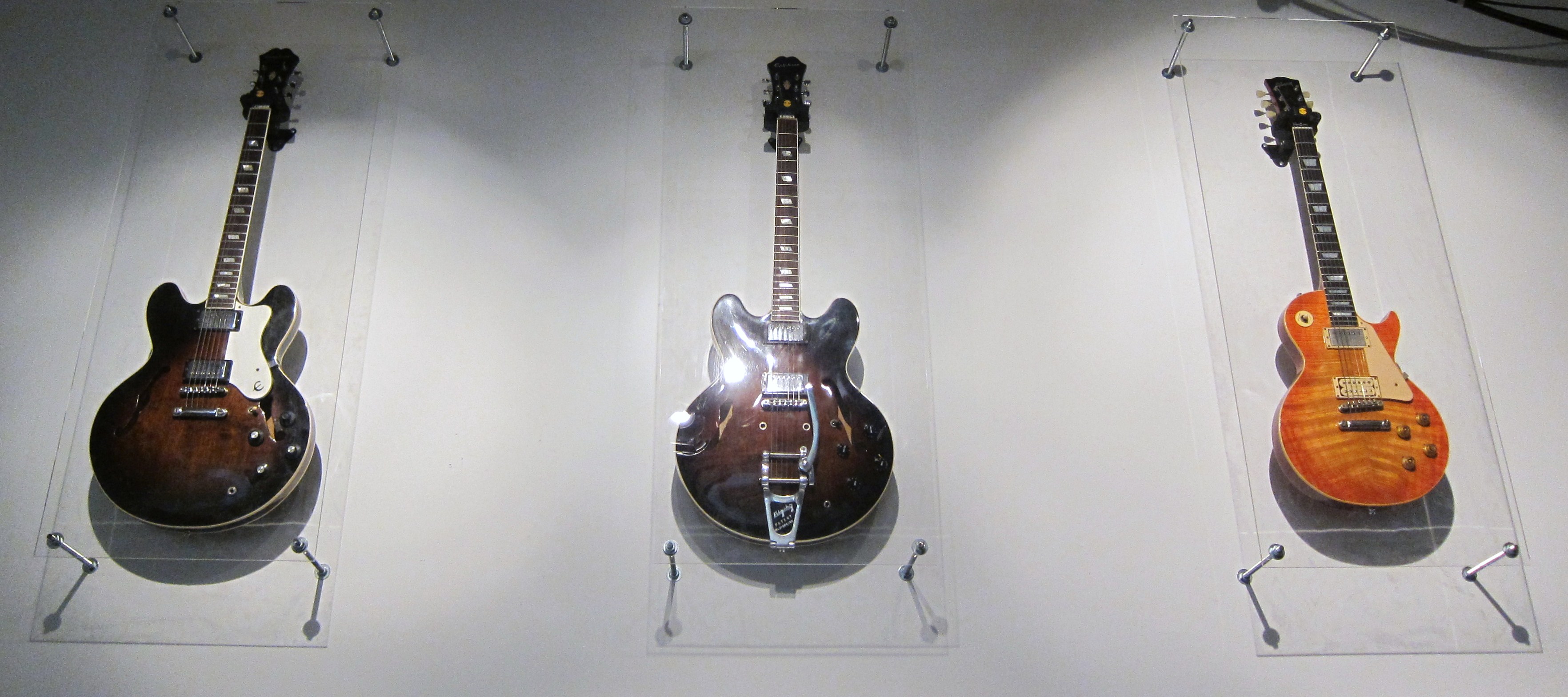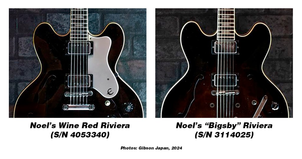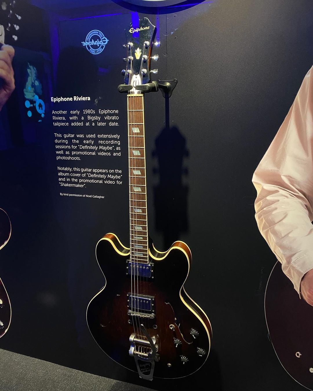 That’s one thing that still baffles me. What was Noel talking about? Was it this guitar or another Matsumoku, spare to Bonehead’s main one? What you say could be a solid theory. However, in various exhibitions, this Bigsby Riviera was described as “Noel’s brown Epiphone Riviera”.