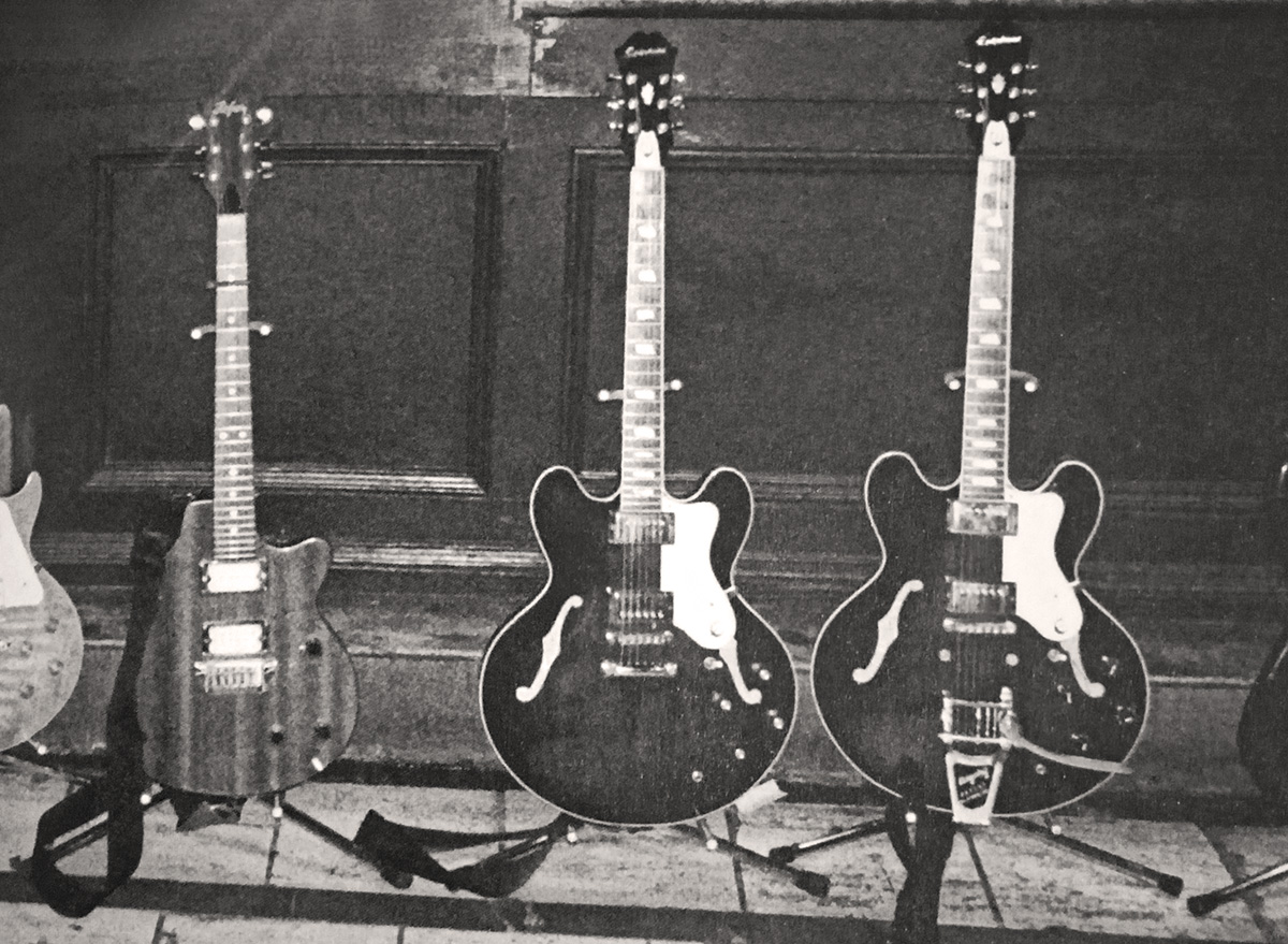 Also shown were the Gibson Les Paul "conversion", the Wine Red Matsumoku Riviera, the Union Jack Sheraton and the Jetglo Rickenbacker 330.