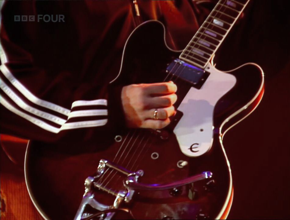 Initially, I mistook it for a Japanese Epiphone Casino that Bonehead had recently acquired, but clearer video clips - and helpful tips from readers23 - confirmed it's the legendary Riviera from the Definitely Maybe cover. On stage, it's been spotted during performances of Whatever and Wonderwall.