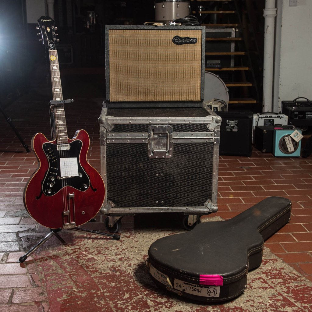 Details This bizarre Epiphone was sold in a package that included the guitar and a 15 watt amp. The amp did not have any controls and was instead controlled by the knobs on the guitar's pickguard by way of a special cable. It was a commercial failure and only 396 were made before the Professional was discontinued in 1967.1 Noel has never played it live. The guitar+amp combo was sold in 2017 for around £5k.2 As of today, it is located at Hard Rock Cafe in Piccadilly, London.