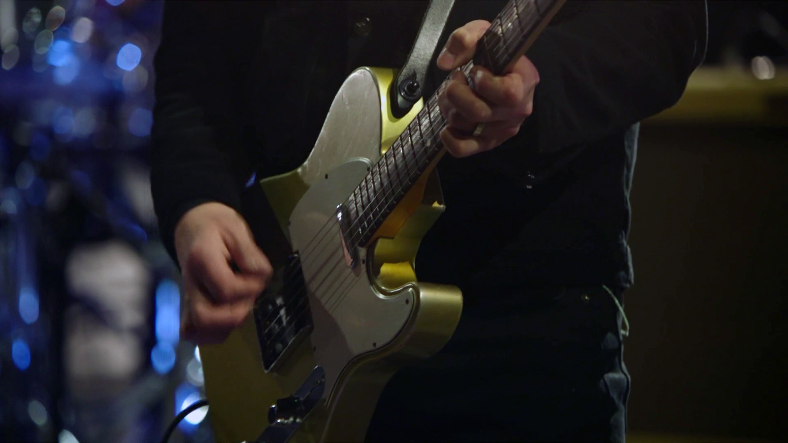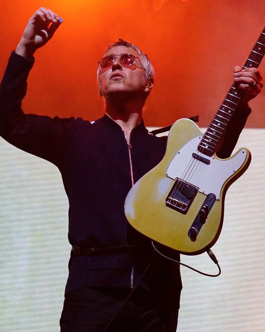 Details This artificially-aged Telecaster was built by one of the Fender Master Builders1 in late 2016, as a custom order by Noel himself. He picked up the guitar on 21 December 2016 at Fender's London Artist Showroom.2 It is finished in a strange colour named Firemist Silver: it is a sort of icy blue/grey that turns to a greenish hue with aging. Noel's Tele definitely looks more green or gold than blue or silver to be honest. It features on the front & back cover art for the album Council Skies. The photos were taken by Kevin Cummins in the exact location that used to be the centre circle of the demolished Maine Road stadium - now the middle of a modern housing estate.3
