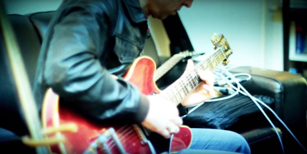 Details At first glance this guitar might be mistaken for Noel's usual ES-355, but it is not: the headstock, the black pickguard and the split parallelogram inlays suggest that it actually is an ES-345. It is not known if it's a vintage model or a reissue, since the guitar is visible for a few frames only in a behind the scenes video.1 As of today, it has never been played live. PS: if you're a Back to the Future fan... this is the Marty McFly model!