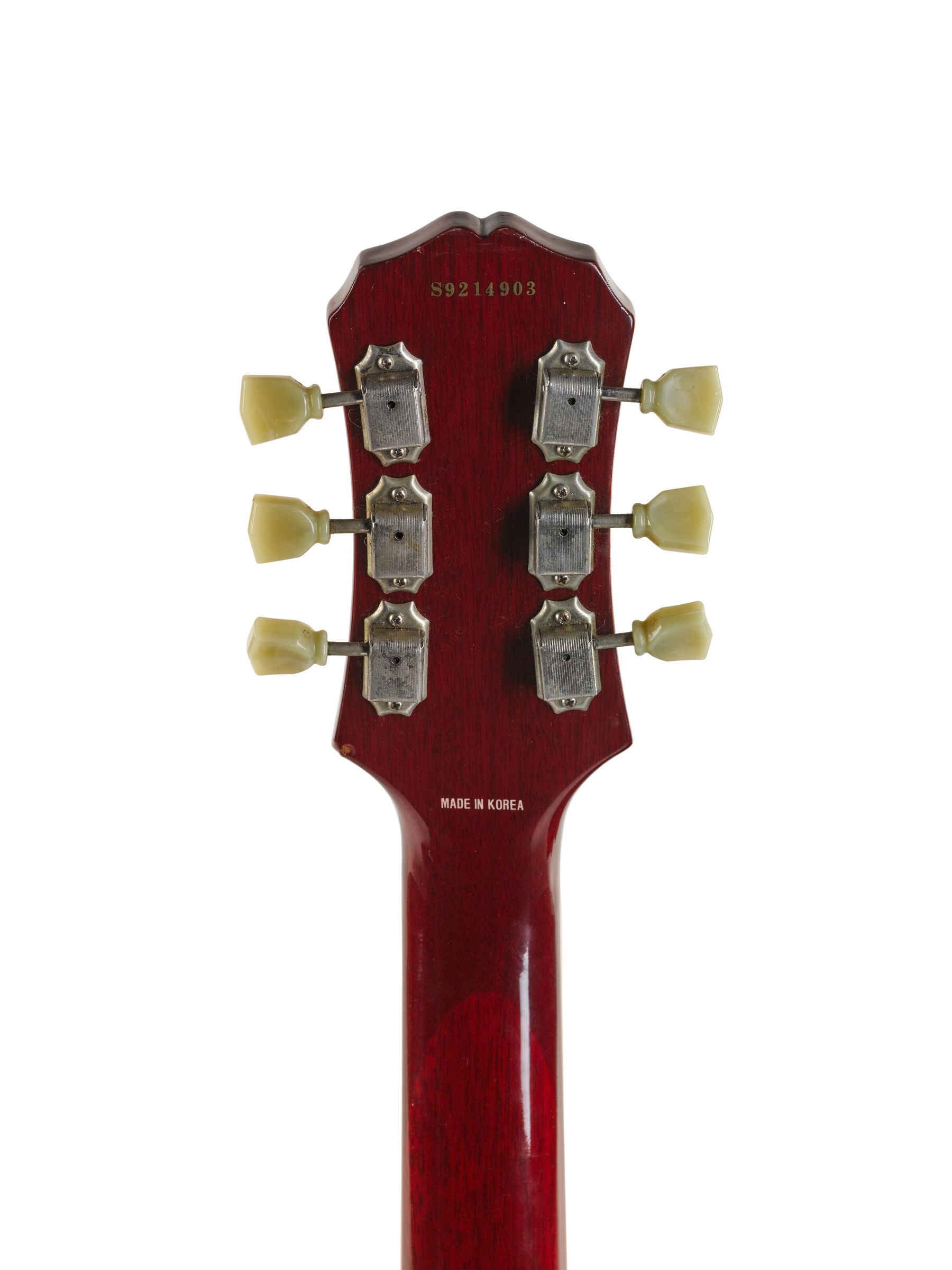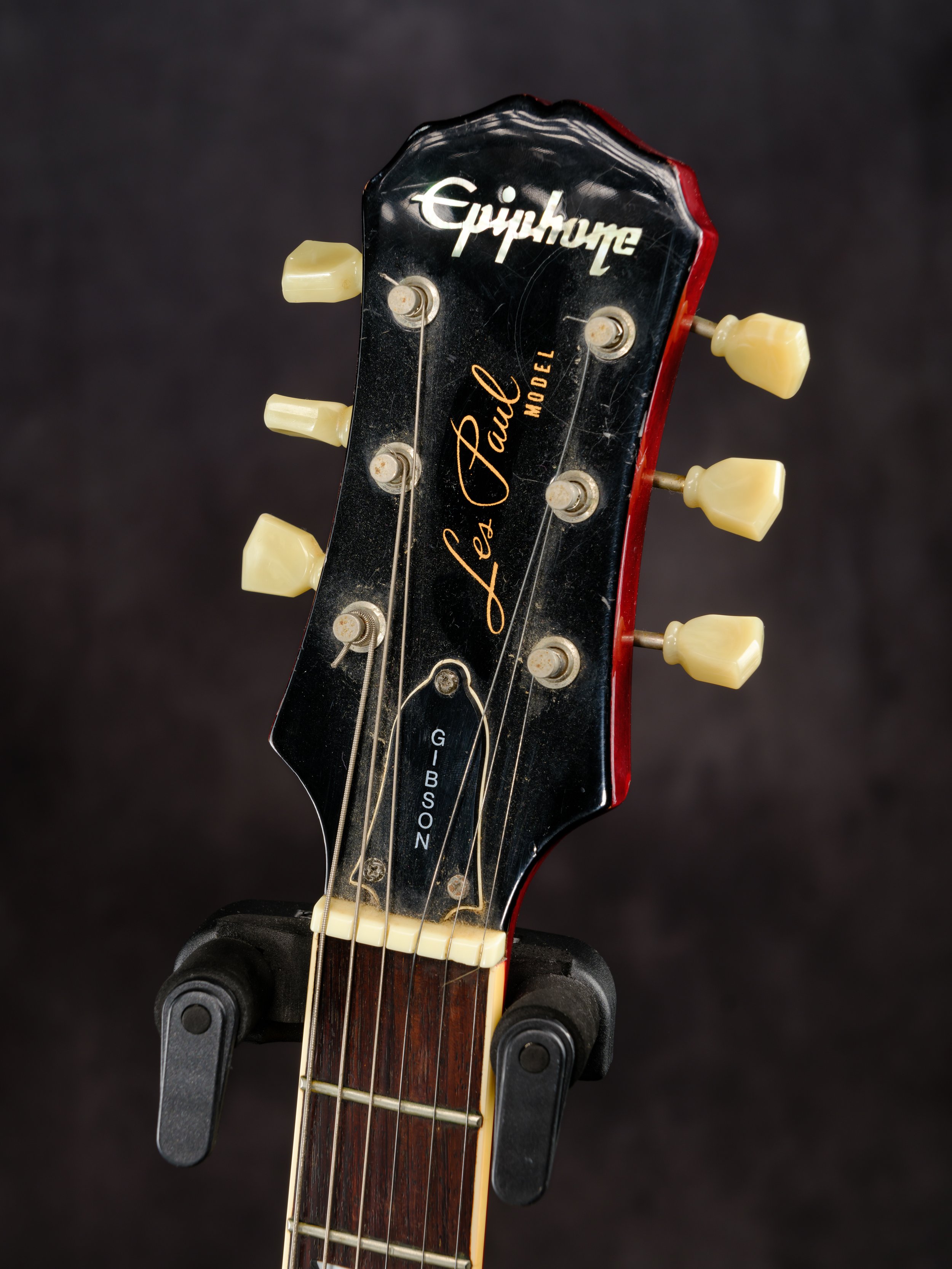Below are some photos showing how the guitar appears today, courtesy of the current owner. It certainly looks well-lived, and it's missing the toggle switch tip and the bridge pickup tone knob. The neck pickup tone knob isn't the original one. Every other part seems to be exactly as it came out of the Epiphone factory in 1992.