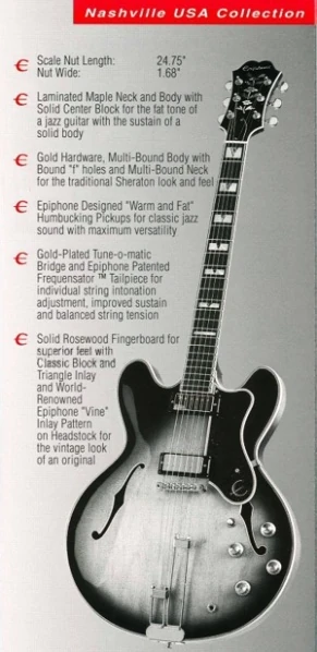 - Original USA Sheratons from the ’60s have a slightly different body shape, different headstock design and logo, different pickguard, etc. ↩︎