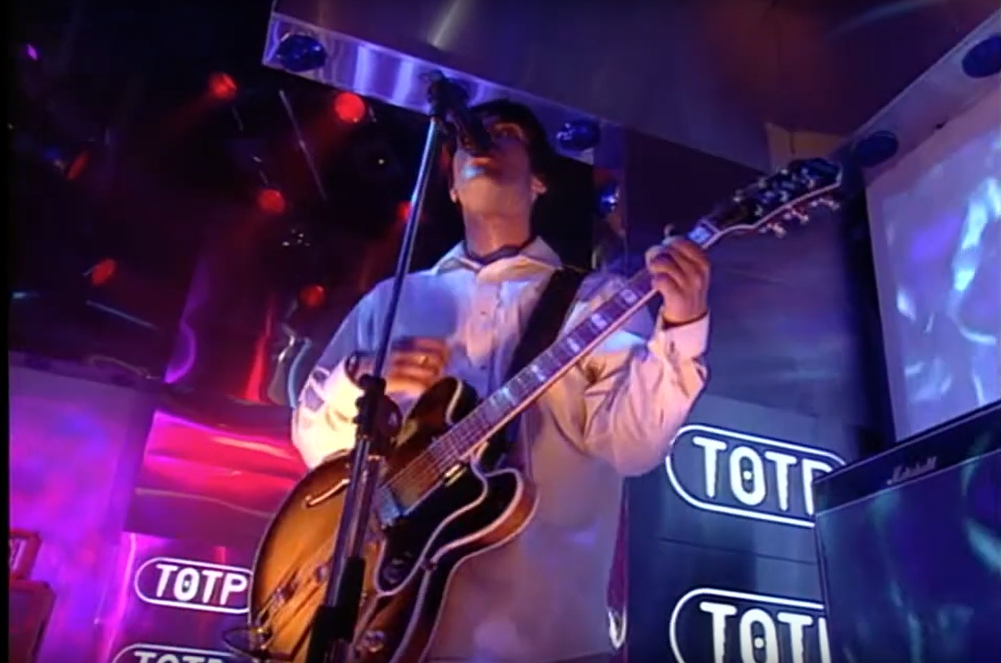 It is unknown how Noel got the guitar: maybe he bought one of those 250 units made in 1993 sometime in 1995 - or maybe an identical Sheraton was built for him by Gibson (Epiphone's parent company) in early 1995. It is known that in late '95 Noel was already in contact with Gibson Artist Relations for the project of a signature Epiphone guitar - that lead to the Supernova model in 1997.7 By the way, in late 1995 Gibson gave Noel another Sheraton - a leftover from the 250 units built in 1993 - that later became the famous Union Jack. The first recorded appearance of the sunburst Sheraton is the mimed performance of Roll With It at Top of the Pops in August 1995: Liam and Noel switched places - with Liam pretending to play guitar!