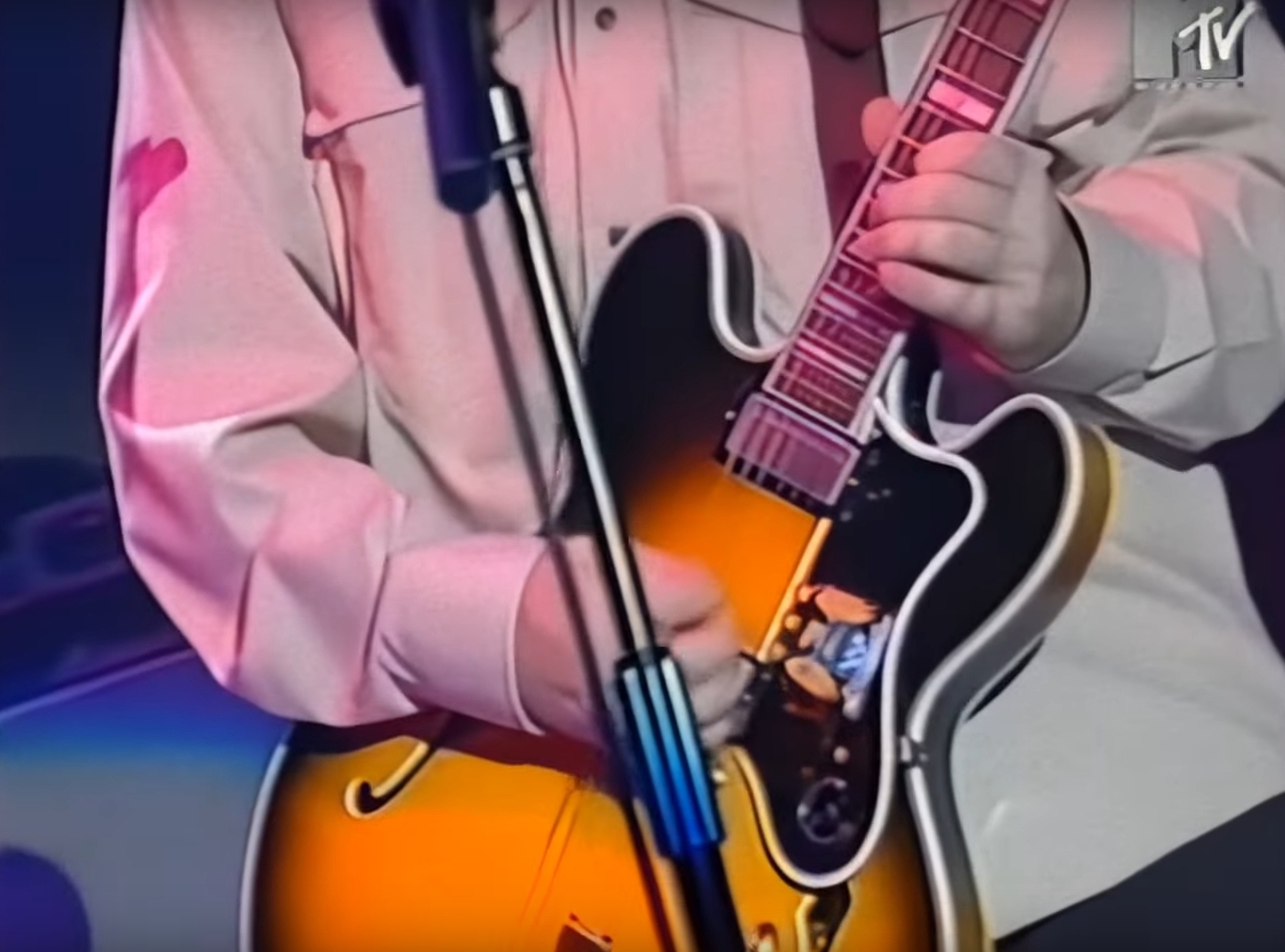 The mystery of the extra inlays If you look closely, you may notice that the 1993 Sheraton Nashville USA Collection has no inlays beyond the 15th fret, while Noel's Sheraton has inlays all the way up to the 21st fret. This was used in the past to dismiss the fact that Noel's one is a Nashville USA Collection Sheraton. The truth is that Noel had some mother-of-pearl inlays added at the 17th, 19th and 21st fret in early 1996 - and he did the same with the Union Jack Sheraton too. Probably they were added not only for looks, but also to have some visible reference points on the fretboard during solos. In a still from Top of the Pops in August 1995 (where the guitar was 'played' by Liam) you can see that the extra inlays are missing, like regular Nashville USA Collection Sheratons. The extra inlays were added by a luthier, because their appearance doesn't match the factory inlays - as it can be clearly seen in a still from Knebworth.
