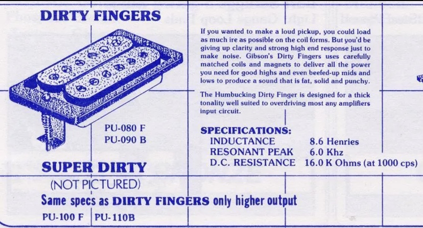 So, what's a "Super Dirty"? Information is scarce, to say the least. According to a Gibson leaflet from the period, it is an even hotter version of the "Dirty Fingers", which is already a very hot pickup due to its high DC resistance and ceramic magnet.