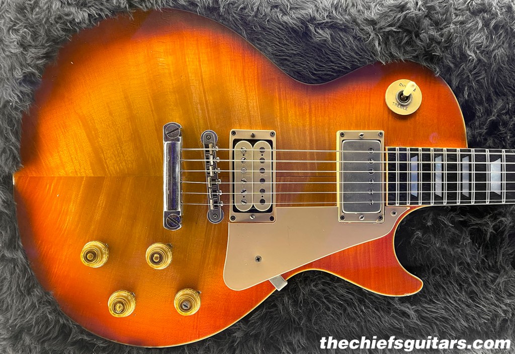 The guitar started life as a 1953 Goldtop, with a trapeze or wrap-around tailpiece and P90 pickups: at a later date it was converted to the coveted 1958-1960 "Burst" specs. This means that it was stripped of the Gold paint and repainted in Cherry Sunburst, the tailpiece was replaced with a stopbar, a tune-o-matic bridge was added and the pickup cavities were rerouted to make space to two full-size humbuckers. This seems almost a sacrilege now, but it happened a lot with early Les Pauls.