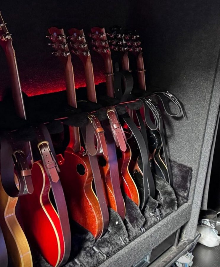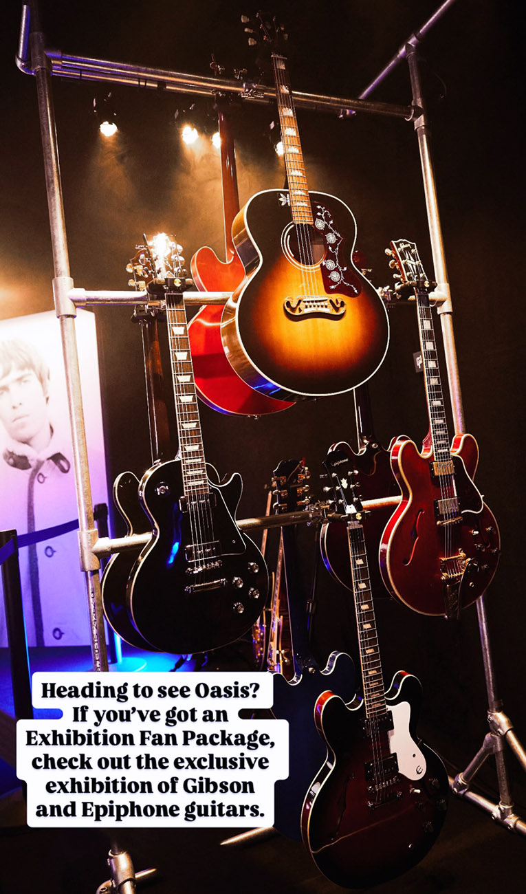 - What started as a visual guess from various photos is now confirmed: thanks to Jacob in the comments, we know that Noel has two of these guitars kept backstage, plus a third one featured in the exhibition. ↩︎